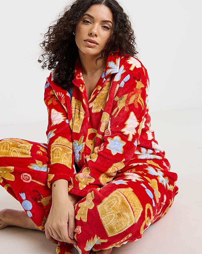 Pretty Secrets Fleece: This Christmas Fleece Family Pyjama pyjama set is ideal for Christmas morning. The set has a regular fit comprising of a long sleeved top and long leg pant. The print is an all over christmas print. The button fastened top has a soft revere collar.